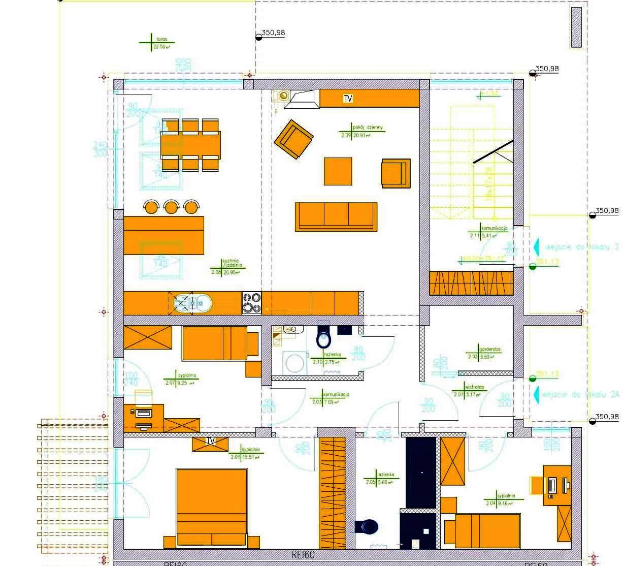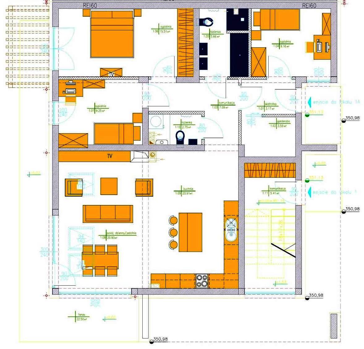 Przedmiotowa nieruchomość składa się z wiatrołapu , trzech sypialni , toalety , łazienki , dużej garderoby ,wysokiego salonu z aneksem kuchennym w stylu loftowym. Wysokość pomieszczeń 2,80 m , wysokość salonu 4,60 m